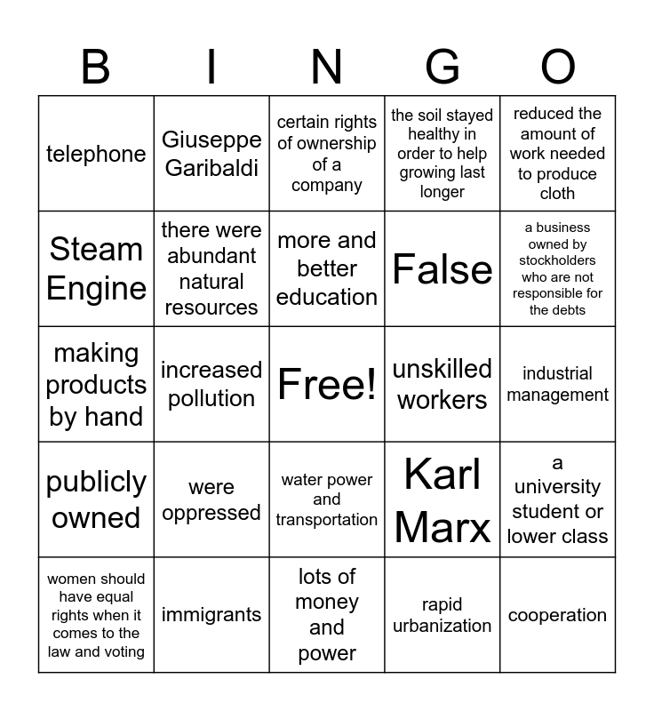 This bingo card has a free space and 35 words: England, textile, the mass production of goods using machines, there were abundant natural resources, water power and transportation, the soil stayed healthy in order to help growing last longer, Steam Engine, poor working conditions for lower class, more and better education, supported business, making products by hand, reduced the amount of work needed to produce cloth, rise in population growth, Ford Motor Company, telephone, unskilled workers, rapid urbanization, increased pollution, publicly owned, cooperation, Karl Marx, women should have equal rights when it comes to the law and voting, a university student or lower class, immigrants, certain rights of ownership of a company, a business owned by stockholders who are not responsible for the debts, industrialize on the European continent, The first automobile, False, industrial management, industrialized slower, lots of money and power, were oppressed, Giuseppe Garibaldi and Otto von Bismarck.