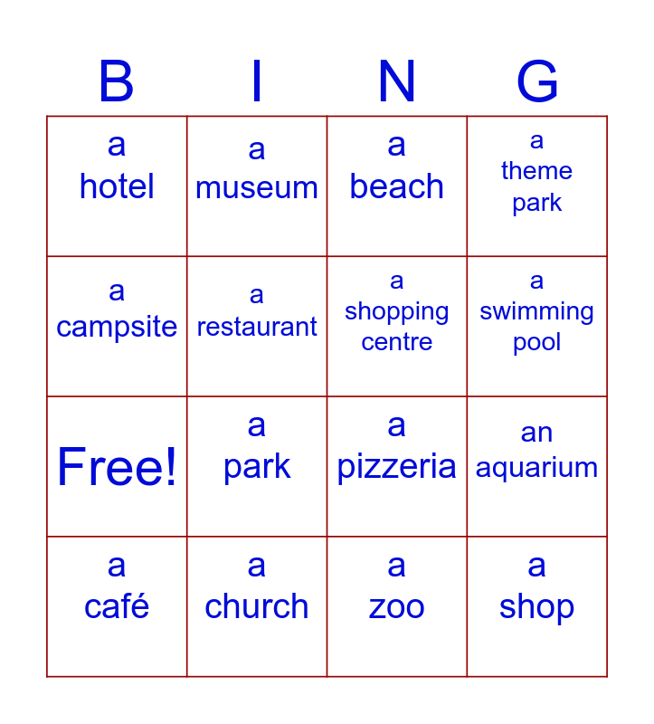 This bingo card has 20 words: an aquarium, an art gallery, a beach, a burger place, a café, a campsite, a church, a hotel, Free!, a museum, a park, a pizzeria, a restaurant, a shop, a shopping centre, a stadium, a swimming pool, a theme park, a zoo and a festival.