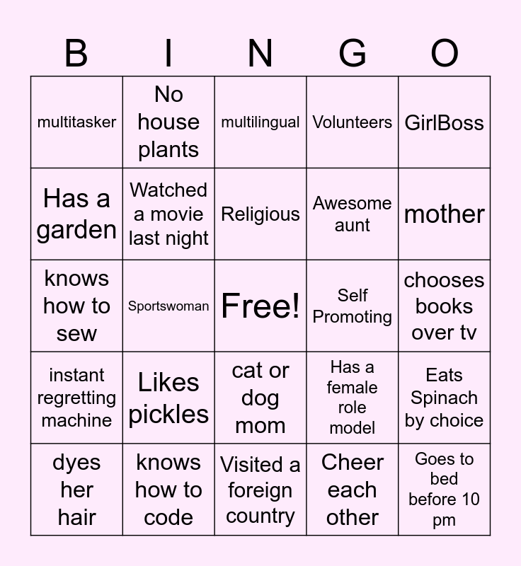 This bingo card has a free space and 50 words: Used Chopsticks, Goes to bed before 10 pm, Made sushi at home, Visited a foreign country, Likes pickles, Finished a book this week, No house plants, Climbed a mountain, Has a garden, Plays any musical instrument, Watched a movie last night, Volunteers, Eats Spinach by choice, Has a female role model, Food Critic, Involved in Politics, Religious, Self Promoting, Won an award, GirlBoss, Sportswoman, Cheer each other, multitasker, Awesome aunt, loves to cook, sister, mother, wife, multilingual, cat or dog mom, business owner, PhD, Has an unusual hobby, met a celebrity, knows how to code, knows basic car mechanics, eldest daughter, exercises regularly, has been to a beach, chooses books over tv, organised, extrovert, dislikes shopping, has more than 10 pairs of shoes, dyes her hair, knows how to sew, wearing purple, loves cotton candy, instant regretting machine and has a clean bedroom right now.
