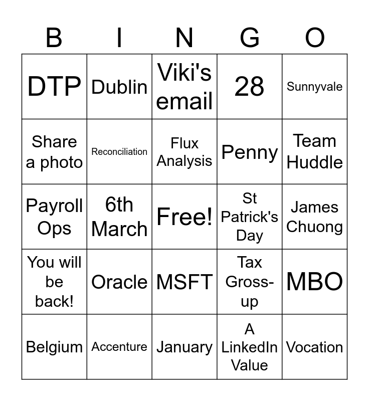 This bingo card has a free space and 24 words: Oracle, Accenture, Flux Analysis, Belgium, Sunnyvale, DTP, Share a photo, Dublin, St Patrick's Day, MSFT, Penny, Payroll Ops, Tax Gross-up, MBO, Reconciliation, A LinkedIn Value, James Chuong, Viki's email, Team Huddle, 6th March, Vocation, You will be back!, 28 and January.