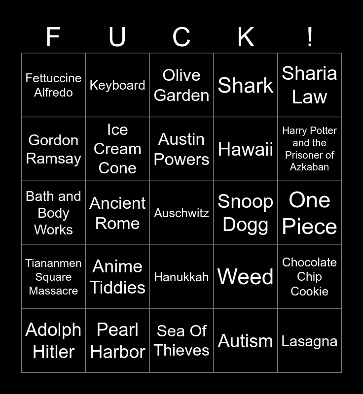 This bingo card has 25 words: Anime Tiddies, Sea Of Thieves, Austin Powers, Adolph Hitler, Sharia Law, Fettuccine Alfredo, Gordon Ramsay, Keyboard, Snoop Dogg, Hanukkah, Hawaii, Bath and Body Works, Weed, Chocolate Chip Cookie, Ice Cream Cone, Lasagna, One Piece, Olive Garden, Harry Potter and the Prisoner of Azkaban, Ancient Rome, Auschwitz, Pearl Harbor, Tiananmen Square Massacre, Shark and Autism.