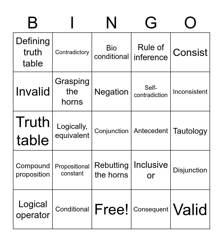 This bingo card has 25 words: Compound proposition, Conditional, Conjunction, Consequent, Consist, Defining truth table, Contradictory, Bio conditional, Antecedent, Disjunction, Invalid, Grasping the horns, Free!, Inclusive or, Inconsistent, Logical operator, Logically, equivalent, Negation, Self-contradiction, Tautology, Truth table, Propositional constant, Rebutting the horns, Rule of inference and Valid.