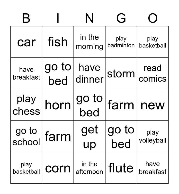⚠ This card has duplicate items: get up (3), read comics (3), in the morning (3), corn (3), have dinner (6), star (3), play volleyball (3), have lunch (3), horn (2), go to school (3), in the afternoon (3), flute (3), play badminton (3), car (3), fish (3), have breakfast (3), go home (3), farm (3), storm (3), new (3), in the evening (3), play basketball (3), play chess (3), go to bed (3), foot (3)