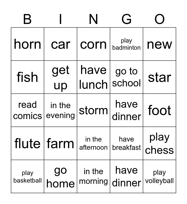 This bingo card has 26 words: in the afternoon, have dinner, have lunch, go home, new, horn, fish, car, foot, have breakfast, go to school, read comics, play chess, play basketball, in the evening, go to bed, play badminton, flute, corn, storm, star, in the morning, have dinner, farm, get up and play volleyball.