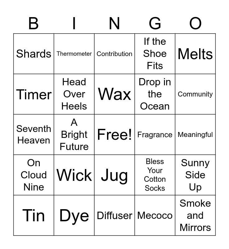 This bingo card has a free space and 24 words: Wick, Dye, Wax, Tin, Melts, Shards, Timer, Thermometer, Fragrance, Jug, Drop in the Ocean, Seventh Heaven, Bless Your Cotton Socks, Sunny Side Up, Head Over Heels, Mecoco, Meaningful, Contribution, Community, A Bright Future, Smoke and Mirrors, On Cloud Nine, If the Shoe Fits and Diffuser.