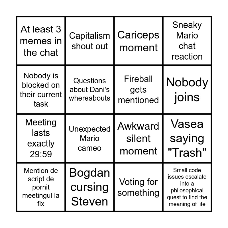 This bingo card has 16 words: Bogdan cursing Steven, Vasea saying "Trash", Cariceps moment, At least 3 memes in the chat, Meeting lasts exactly 29:59, Capitalism shout out, Awkward silent moment, Voting for something, Nobody is blocked on their current task, Questions about Dani's whereabouts, Mention de script de pornit meetingul la fix, Sneaky Mario chat reaction, Unexpected Mario cameo, Nobody joins, Fireball gets mentioned and Small code issues escalate into a philosophical quest to find the meaning of life.