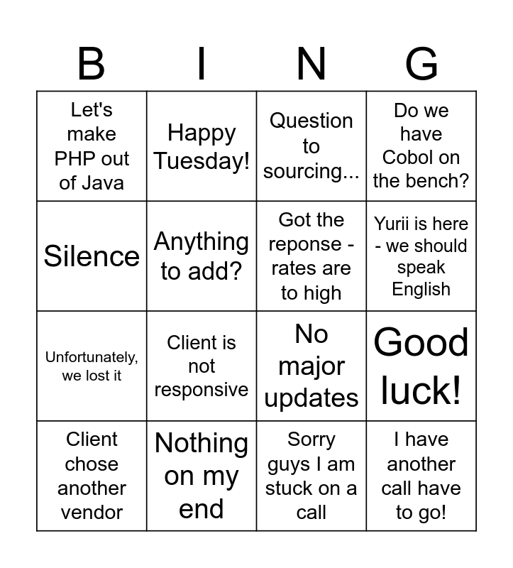 This bingo card has 16 words: Nothing on my end, Good luck!, Question to sourcing..., Let's make PHP out of Java, Unfortunately, we lost it, Happy Tuesday!, No major updates, Sorry guys I am stuck on a call, Silence, Anything to add?, Client chose another vendor, Do we have Cobol on the bench?, Client is not responsive, Yurii is here - we should speak English, Got the reponse - rates are to high and I have another call have to go!.