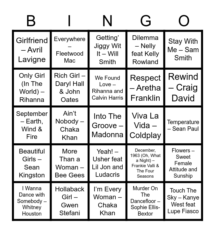 This bingo card has 94 words: Free!, Miss Independent – Ne-Yo, I’m Every Woman – Chaka Khan, Young Hearts Run Free – Candi Staton, Let’s Get It On – Marvin Gaye, I’m Coming Out – Diana Ross, My Girl – The Temptations, I Wanna Dance with Somebody – Whitney Houston, Valerie – Mark Ronson feat. Amy Winehouse, Kiss – Prince, Forget You – Cee Lo Green, Got To Give It Up – Marvin Gaye, Crazy In Love – Beyonce feat. Jay-Z, Respect – Aretha Franklin, You Can’t Hurry Love – The Supremes, Stay With Me – Sam Smith, Getting’ Jiggy Wit It – Will Smith, Don’t Stop ‘Til You Get Enough – Michael Jackson, Ain’t No Mountain High Enough – Marvin Gaye and Tammi Terrell, We Are Family – Sister Sledge, I Want You Back – The Jackson 5, Sir Duke – Stevie Wonder, American Boy – Estelle feat Kanye West, Love Train – The O’Jays, More Than a Woman – Bee Gees, Rich Girl – Daryl Hall & John Oates, I Got You (I Feel Good) – James Brown, Touch The Sky – Kanye West feat Lupe Fiasco, (Your Love Keeps Lifting Me) Higher & Higher – Jackie Wilson, It Wasn’t Me – Shaggy feat Rik Rok, Hollaback Girl – Gwen Stefani, Yeah! – Usher feat Lil Jon and Ludacris, It’s Your Thing – The Isley Brothers, Ain’t No Stoppin’ Us Now – McFadden & Whitehead, Everywhere – Fleetwood Mac, Rather Be – Clean Bandit feat Jess Glynne, Rehab – Amy Winehouse, Superstition – Stevie Wonder, We Found Love – Rihanna and Calvin Harris, December, 1963 (Oh, What a Night) – Frankie Valli & The Four Seasons, September – Earth, Wind & Fire, Beautiful Girls – Sean Kingston, Temperature – Sean Paul, You Make My Dreams (Come True) – Daryl Hall & John Oates, Into The Groove – Madonna, Push The Button – Sugababes, Don’t Stop The Music – Rihanna, Get Busy – Sean Paul, Baby – Justin Bieber, Boogie Wonderland – Earth, Wind & Fire and The Emotions, Le Freak – CHIC, Murder On The Dancefloor – Sophie Ellis-Bextor, Hey Ya! – Outkast, Move Your Feet – Junior Senior, Crazy – Gnarls Barkley, Happy – Pharrell Williams, No Scrubs – TLC, No One – Alicia Keys, My Love Don’t Cost a Thing – Jennifer Lopez, Bootylicious – Destiny’s Child, Ain’t Nobody – Chaka Khan, Rock Your Body – Justin Timberlake, Get Ur Freak On – Missy Elliot, Superstar – Jamelia, Milkshake – Kelis, Dancing in the Moonlight – Toploader, All Night Long – Lionel Richie, Livin’ la Vida Loca – Ricky Martin, Only Girl (In The World) – Rihanna, Toxic – Britney Spears, Oops!... I Did It Again – Britney Spears, I’m Outta Love – Anastacia, Bennie And The Jets – Elton John, Candy – Cameo, Dilemma – Nelly feat Kelly Rowland, What You Won’t Do for Love – Bobby Caldwell, Push It – Salt-N-Pepa, Rewind – Craig David, Flowers – Sweet Female Attitude and Sunship, Body Groove – Architechs feat Nay Nay, Moving Too Fast – Artful Dodger feat Romina Johnson, Numb – Linkin Park, Paradise – Coldplay, Viva La Vida – Coldplay, Girlfriend – Avril Lavigne, This Love – Maroon 5, Budapest – George Ezra, Africa – TOTO, Dog Days Are Over – Florence + The Machine, Let Her Go – Passenger, Here Comes The Sun – The Beatles, Dreams – Fleetwood Mac, Stand By Me – Ben E. King and Just Like a Pill – P!nk.