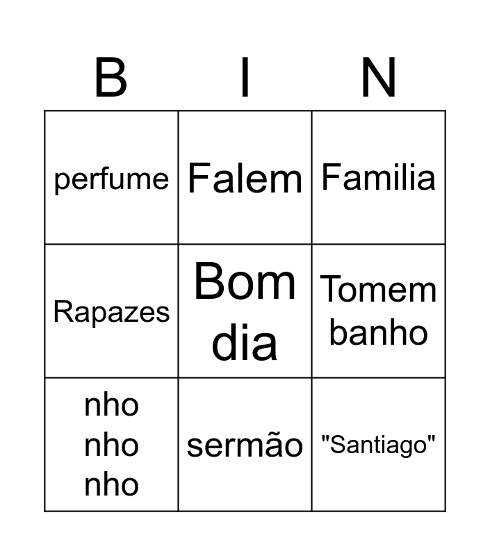 This bingo card has a free space and 8 words: Tomem banho, Familia, Falem, nho nho nho, perfume, "Santiago", Rapazes and sermão.