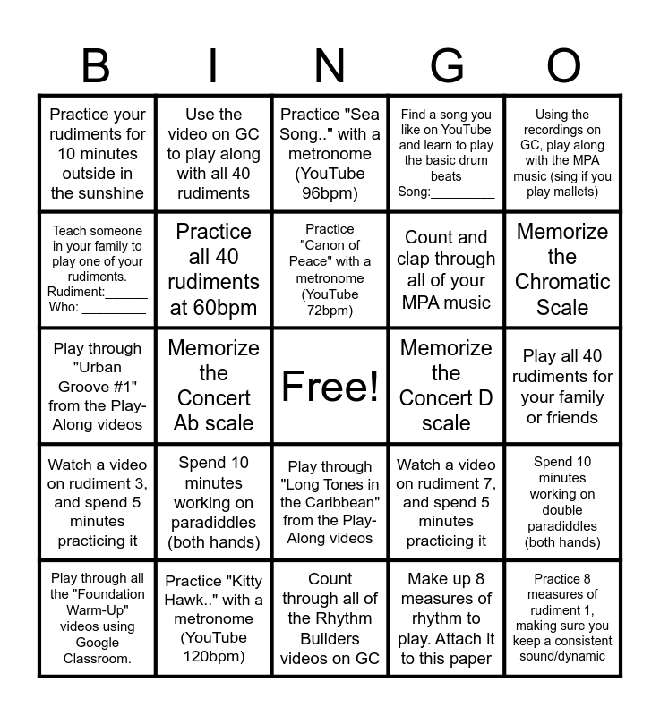 This bingo card has a free space and 24 words: Spend 10 minutes working on paradiddles (both hands), Practice "Kitty Hawk.." with a metronome (YouTube 120bpm), Practice "Canon of Peace" with a metronome (YouTube 72bpm), Play through all the "Foundation Warm-Up" videos using Google Classroom., Using the recordings on GC, play along with the MPA music (sing if you play mallets), Practice your rudiments for 10 minutes outside in the sunshine, Teach someone in your family to play one of your rudiments. Rudiment:______ Who: _________, Use the video on GC to play along with all 40 rudiments, Memorize the Concert D scale, Play through "Long Tones in the Caribbean" from the Play-Along videos, Count and clap through all of your MPA music, Play through "Urban Groove #1" from the Play-Along videos, Watch a video on rudiment 7, and spend 5 minutes practicing it, Spend 10 minutes working on double paradiddles (both hands), Practice all 40 rudiments at 60bpm, Make up 8 measures of rhythm to play. Attach it to this paper, Play all 40 rudiments for your family or friends, Practice "Sea Song.." with a metronome (YouTube 96bpm), Memorize the Chromatic Scale, Memorize the Concert Ab scale, Practice 8 measures of rudiment 1, making sure you keep a consistent sound/dynamic, Watch a video on rudiment 3, and spend 5 minutes practicing it, Find a song you like on YouTube and learn to play the basic drum beats Song:_________ and Count through all of the Rhythm Builders videos on GC.
