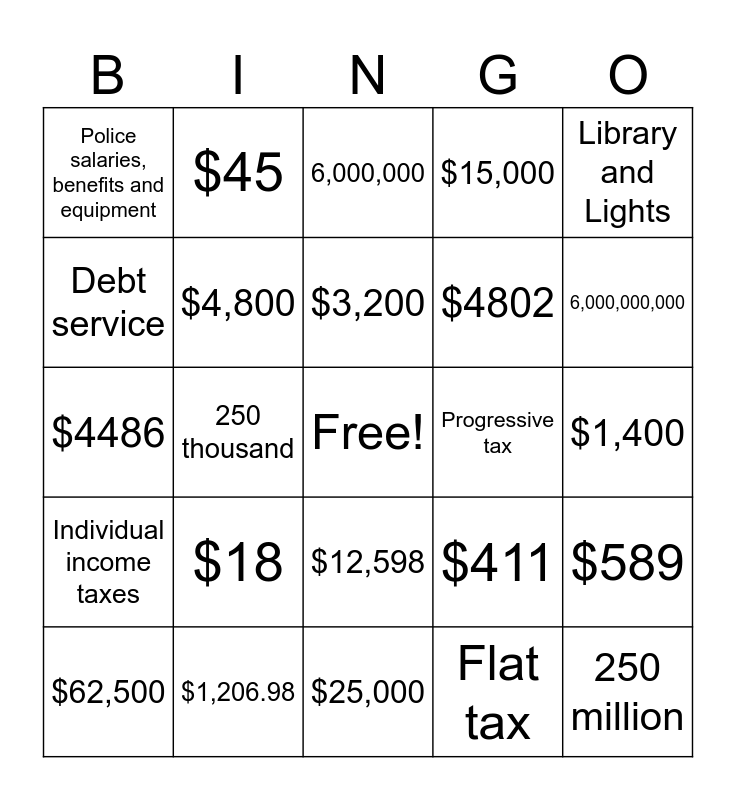 This bingo card has a free space and 24 words: $18, $1,206.98, $3,200, $62,500, Library and Lights, Police salaries, benefits and equipment, Debt service, $45, Progressive tax, $12,598, $4802, $4486, $411, $589, $4,800, Flat tax, $1,400, 6,000,000, 6,000,000,000, 250 thousand, 250 million, Individual income taxes, $15,000 and $25,000.