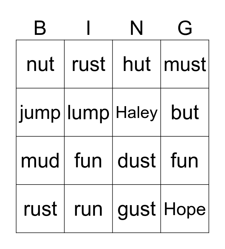 This bingo card has 16 words: run, fun, hut, nut, mud, rust, dust, gust, jump, lump, rust, must, fun, but, Haley and Hope.