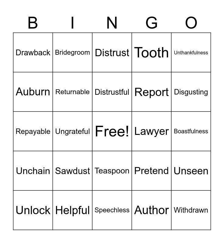 This bingo card has a free space and 116 words: Food, Soon, Feed, Flow, Spoon, Choose, Tooth, Rooster, Broom, Brain, Smooth, Scooter, Moonlight, Cartoon, Toothbrush, Schoolroom, Teaspoon, Shampoo, Raccoon, Afternoon, Unlock, Distrust, Agreeable, Handful, Unreal, Unchain, Helpful, Teachable, Drinkable, Faithful, Disgusting, Distrustful, Ungrateful, Yawn, Fault, Claw, Haul, Float, Draw, Spool, Crawl, Cool, Lawn, Loan, Cause, Exhaust, Author, Auburn, August, Drawing, Lawn Mower, Lawyer, Igloo, Imperfect, Advertise, Return, Preheat, Madness, Helpless, Refill, Unseen, Prepay, Discard, Endless, Freshness, Portable, Grateful, Returnable, Repayable, Unthinkable, Boastfulness, Unpreventable, Distrustfulness, Applause, Coleslaw, Withdrawn, Sawdust, Drawback, Autumn, Sweepstakes, Wayside, Bridegroom, Entertainment, Pretend, Report, Dismay, Unhurt, Nameless, Likeness, Affordable, Pocketful, Remarkable, Distinctness, Unteachable, Unthankfulness, Pauper, Sawmill, Because, Seesaw, Awesome, Launder, Autoharp, Automatic, Misinterpret, Understood, Predict, Unpack, Disgust, Speechless, Smoothness, Bucketful, Doable, Recording, Preventable, Presentable and Refillable.