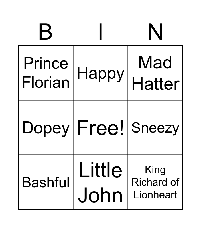 This bingo card has a free space and 51 words: Cruella, Dalmation, T.Rex, Alan Grant, Snow White, Wicked Queen, Happy, Grumpy, Sneezy, Doc, Bashful, Dopey, Superfish, Three little pigs, Robin Hood, Maid Marian, Little John, Friar Tuck, Sheriff of Nottingham, King Richard of Lionheart, Outlaw, Sleepy, Prince Florian, Harry Potter, Dumbledore, Snape, Professor Mcgonagall, Bellatrix Lestrange, Alice in Wonderland, Mad Hatter, Where's Wally, Little Miss Bossy, Mr Bump, Mr Perfect, Mr Geek, Hobbit, Theseus, Titania, Fairies, Puck, Egeus, Lysander, Hermia, Bottom, Shakespeare, Pirates from Treasure Island, Friar Tuck, Piglet, Tigger, Owl and Winnie the pooh.