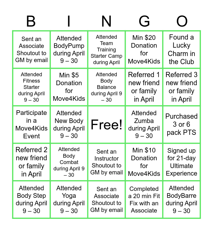 This bingo card has a free space and 24 words: Attended Body Combat during April 9 – 30, Attended Yoga during April 9 – 30, Attended Body Balance during April 9 – 30, Attended Body Step during April 9 – 30, Found a Lucky Charm in the Club, Sent an Associate Shoutout to GM by email, Attended Fitness Starter during April 9 – 30, Attended BodyPump during April 9 – 30, Attended Zumba during April 9 – 30, Sent an Instructor Shoutout to GM by email, Referred 1 new friend or family in April, Participate in a Move4Kids Event, Min $10 Donation for Move4Kids, Signed up for 21-day Ultimate Experience, Min $5 Donation for Move4Kids, Completed a 20 min Fit Fix with an Associate, Purchased 3 or 6 pack PTS, Attended Team Training Starter Camp during April, Referred 3 new friend or family in April, Attended New Body during April 9 – 30, Attended BodyBarre during April 9 – 30, Referred 2 new friend or family in April, Min $20 Donation for Move4Kids and Sent an Associate Shoutout to GM by email.