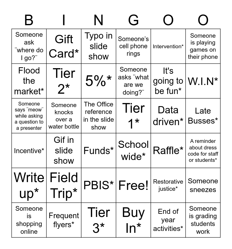This bingo card has 36 words: Free!, PBIS*, Buy In*, Flood the market*, Incentive*, Tier 1*, Tier 2*, Tier 3*, Intervention*, Restorative justice*, W.I.N*, Someone’s cell phone rings, Someone sneezes, Someone knocks over a water bottle, Someone asks ¨what are we doing?¨, Someone ask ¨where do I go?¨, Write up*, Data driven*, Someone says ¨meow¨ while asking a question to a presenter, Typo in slide show, The Office reference in the slide show, Gif in slide show, School wide*, Funds*, Raffle*, Gift Card*, It's going to be fun*, Frequent flyers*, 5%*, Someone is playing games on their phone, Someone is grading students work, Someone is shopping online, A reminder about dress code for staff or students*, Late Busses*, Field Trip* and End of year activities*.