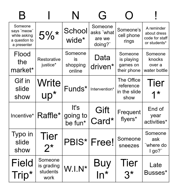 This bingo card has 36 words: Free!, PBIS*, Buy In*, Flood the market*, Incentive*, Intervention*, Restorative justice*, W.I.N*, Someone’s cell phone rings, Someone sneezes, Someone knocks over a water bottle, Someone asks ¨what are we doing?¨, Someone ask ¨where do I go?¨, Write up*, Data driven*, Someone says ¨meow¨ while asking a question to a presenter, Typo in slide show, The Office reference in the slide show, Gif in slide show, School wide*, Funds*, Raffle*, Gift Card*, It's going to be fun*, Frequent flyers*, 5%*, Someone is playing games on their phone, Someone is grading students work, Someone is shopping online, A reminder about dress code for staff or students*, Late Busses*, Field Trip*, End of year activities*, Tier 1*, Tier 2* and Tier 3*.