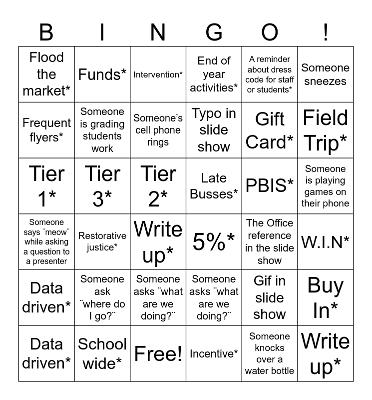 This bingo card has 40 words: Free!, Gift Card*, It's going to be fun*, Frequent flyers*, 5%*, Someone is playing games on their phone, Someone is grading students work, Someone is shopping online, A reminder about dress code for staff or students*, Late Busses*, Field Trip*, End of year activities*, Tier 1*, Tier 2*, Tier 3*, PBIS*, Buy In*, Flood the market*, Incentive*, Intervention*, Restorative justice*, W.I.N*, Someone’s cell phone rings, Someone sneezes, Someone knocks over a water bottle, Someone asks ¨what are we doing?¨, Someone ask ¨where do I go?¨, Write up*, Data driven*, Someone asks ¨what are we doing?¨, Someone ask ¨where do I go?¨, Write up*, Data driven*, Someone says ¨meow¨ while asking a question to a presenter, Typo in slide show, The Office reference in the slide show, Gif in slide show, School wide*, Funds* and Raffle*.