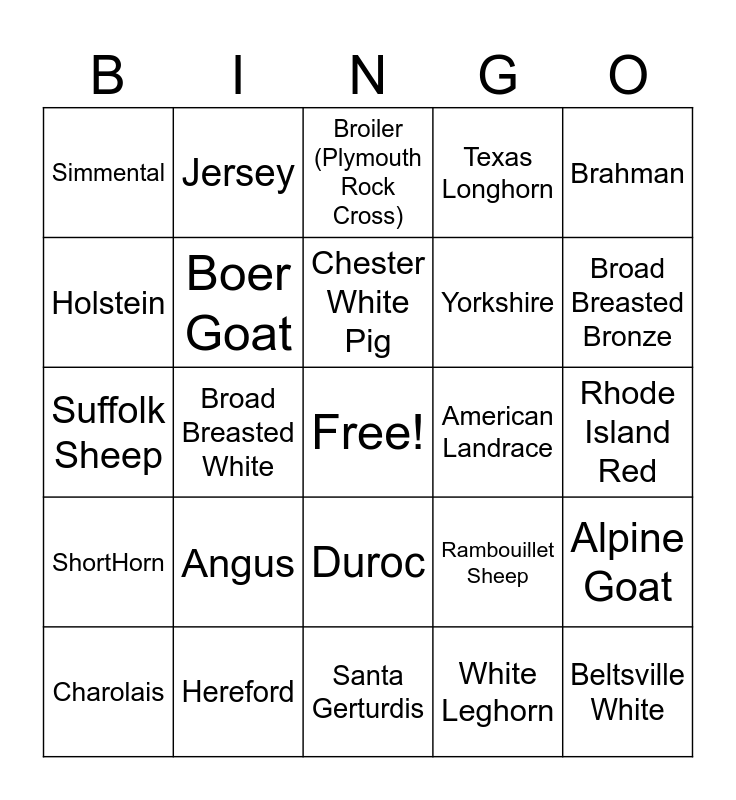 This bingo card has a free space and 24 words: Angus, Hereford, Chester White Pig, Charolais, Brahman, Simmental, Holstein, Jersey, American Landrace, Duroc, Yorkshire, Suffolk Sheep, Rambouillet Sheep, Alpine Goat, Boer Goat, White Leghorn, Rhode Island Red, Broiler (Plymouth Rock Cross), Broad Breasted Bronze, Broad Breasted White, Beltsville White, ShortHorn, Texas Longhorn and Santa Gerturdis.