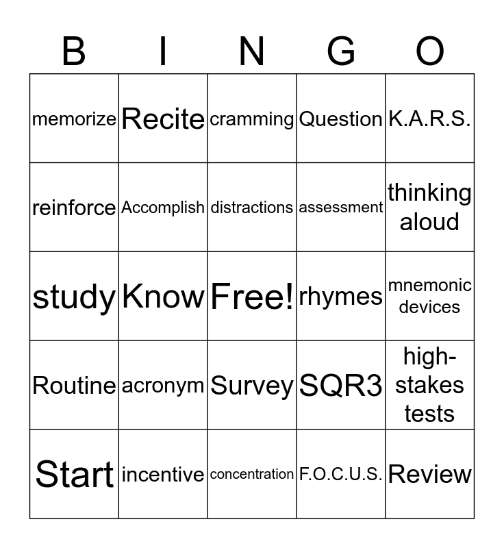 This bingo card has a free space and 24 words: acronym, incentive, distractions, Start, K.A.R.S., memorize, reinforce, Recite, rhymes, Survey, assessment, study, SQR3, high-stakes tests, Accomplish, F.O.C.U.S., mnemonic devices, cramming, thinking aloud, Know, Review, Routine, Question and concentration.