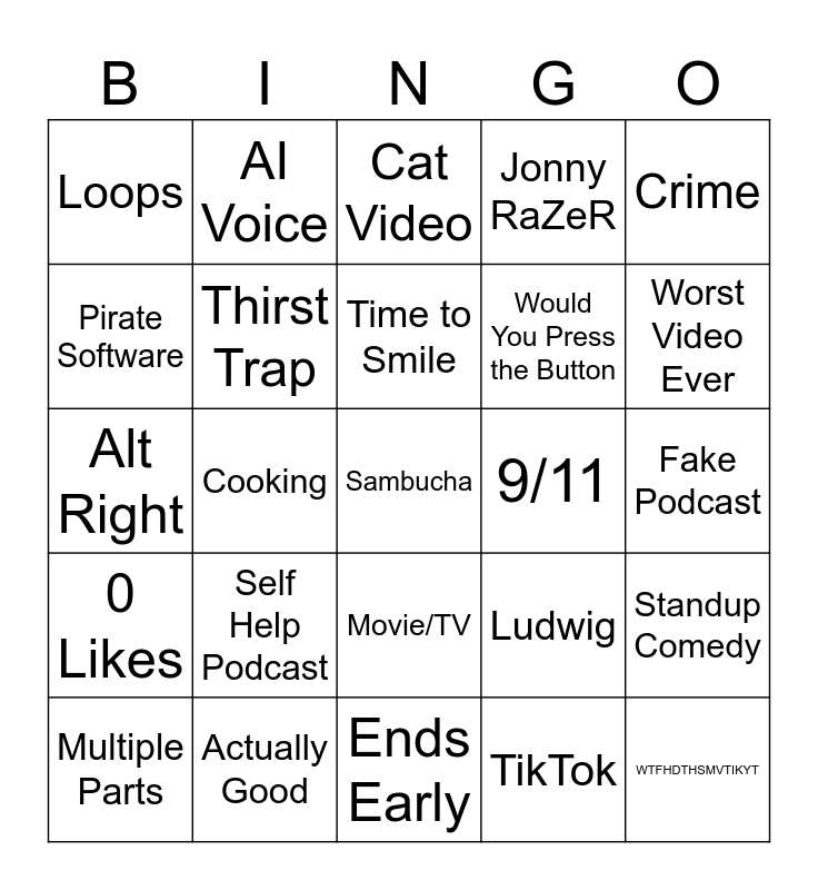 This bingo card has 34 words: WTFHDTHSMVTIKYT, TikTok, Literal Ad, Street Interview, 0 Likes, Thirst Trap, Crime, Multiple Parts, AI Voice, Mr Beast, Time to Smile, Cat Video, Brain Rot, Core Core, 9/11, Worst Video Ever, Actually Good, Alt Right, Self Help Podcast, Ludwig, Movie/TV, Reddit Story, Loops, Fake Podcast, Ends Early, Sambucha, Jonny RaZeR, Greenscreen Kid, Would You Press the Button, Pirate Software, Gymbro, Cooking, Standup Comedy and Anime.