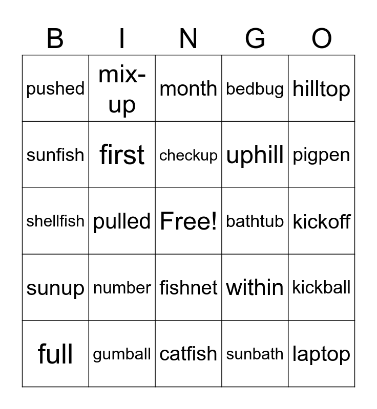 This bingo card has a free space and 29 words: full, pull, pulled, push, pushed, month, first, number, bathtub, gumball, kickoff, laptop, catfish, sunbath, pigpen, sunset, fishnet, sunup, hilltop, shellfish, within, dishpan, uphill, sunfish, bedbug, mix-up, kickball, checkup and backpack.