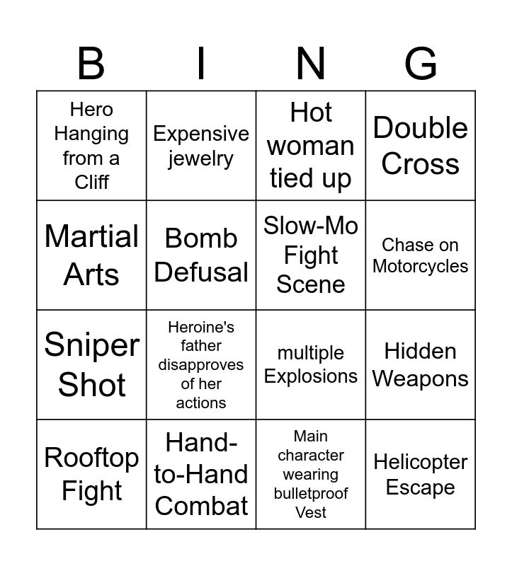 This bingo card has 40 words: Free!, multiple Explosions, Car Chase with stunts, Slow-Mo Fight Scene, Undercover Cop, Villain’s Lair, Chase on Motorcycles, Corrupt Politician, Martial Arts, Helicopter Escape, Hidden Weapons, Double Cross, Rooftop Fight, Main character wearing bulletproof Vest, Hand-to-Hand Combat, Kidnapping, Chase Through Crowded Market, Hero Hanging from a Cliff, Bullet wound, Hot woman tied up, Escape from Burning Building, Underwater Fight, Sniper Shot, Bomb Defusal, Parkour Chase defying rules of physics, Desert, Ticking Time Bomb, Climbing Skyscrapers, Betrayal, Fistfight in the Rain, Sword Fight, Escape on Jet Skis, Chase Through Narrow Alleys, Everyone starts dancing, Heroine's father disapproves of her actions, Secret twin / sibling, protagonist sings about love, Glamorous party, Expensive jewelry and Boss helps a protagonist.