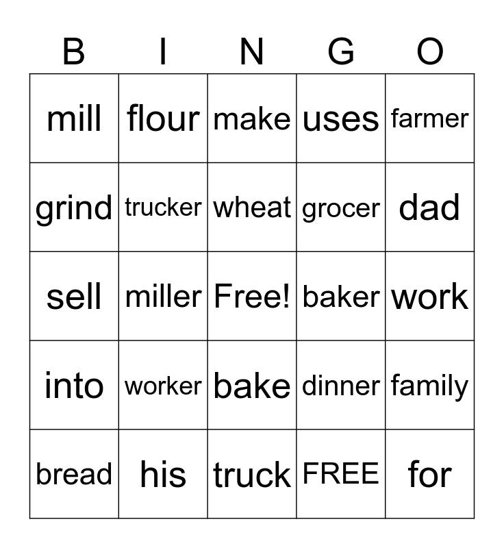 This bingo card has a free space and 25 words: worker, truck, wheat, bread, farmer, mill, grind, flour, baker, bake, grocer, sell, dinner, family, trucker, farm, work, make, dad, miller, for, his, into, uses and FREE.