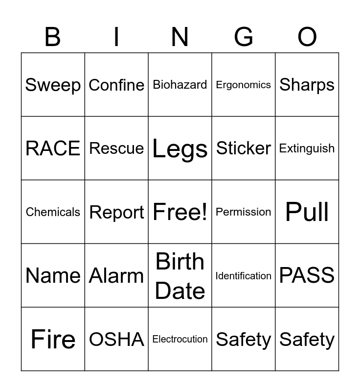 This bingo card has a free space and 29 words: Fire, Needle, Report, Falls, Sweep, Biohazard, Rescue, Alarm, Permission, OSHA, Pull, Safety, Electrocution, Safety, Extinguish, Push, Birth Date, Name, Sharps, Chemicals, Identification, Body Mechanics, Sticker, RACE, Ergonomics, Confine, PASS, Legs and SDS.