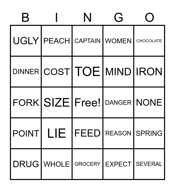 This bingo card has a free space and 29 words: BLIND, WHOLE, CAPTAIN, ANSWER, CHOCOLATE, UGLY, COST, TOE, DANGER, SPRING, DRUG, SIZE, EXPECT, SEVERAL, FORK, RULER, GROCERY, REASON, IRON, POINT, LIE, OUGHT, MIND, NONE, DINNER, PEACH, FEED, WOMEN and ALONE.