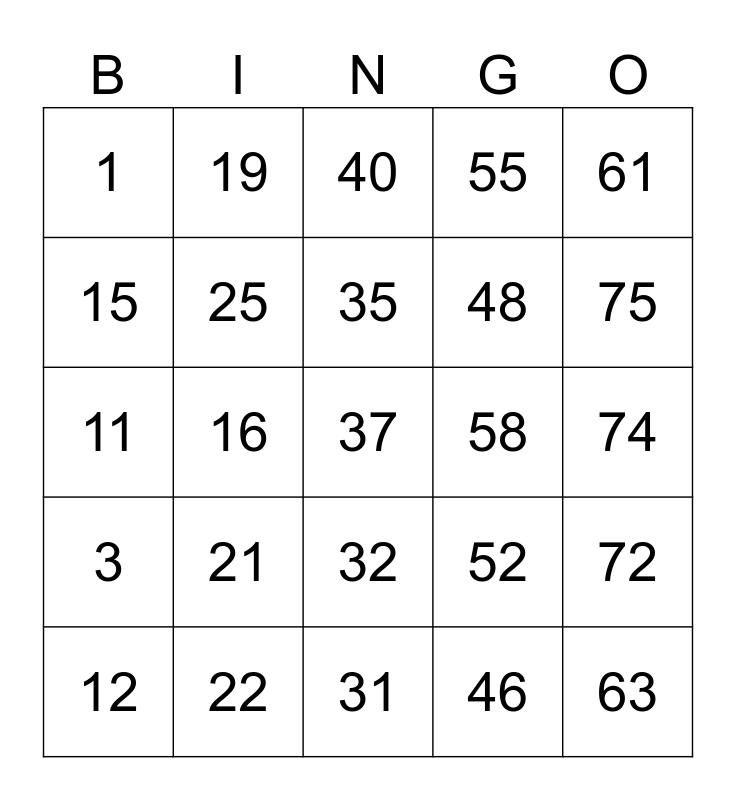 This bingo card has 26 words: 3, 22, 35, 46, 61, 1, 25, 40, 48, 63, 15, 16, 31, 52, 74, 12, 19, 32, 55, 72, 11, 21, 37, 58, 75 and 12.