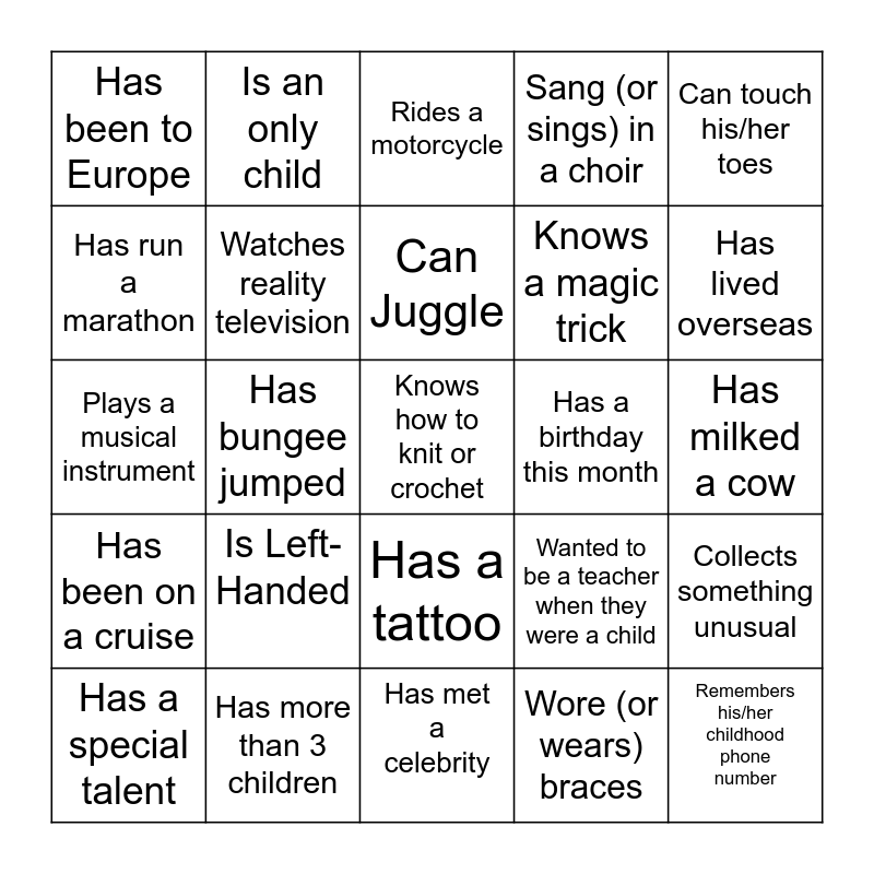 This bingo card has 25 words: Is Left-Handed, Has met a celebrity, Can Juggle, Has a special talent, Can touch his/her toes, Has been to Europe, Has run a marathon, Is an only child, Has a birthday this month, Has a tattoo, Knows a magic trick, Plays a musical instrument, Wanted to be a teacher when they were a child, Collects something unusual, Watches reality television, Remembers his/her childhood phone number, Has milked a cow, Rides a motorcycle, Has lived overseas, Has bungee jumped, Knows how to knit or crochet, Has more than 3 children, Has been on a cruise, Sang (or sings) in a choir and Wore (or wears) braces.