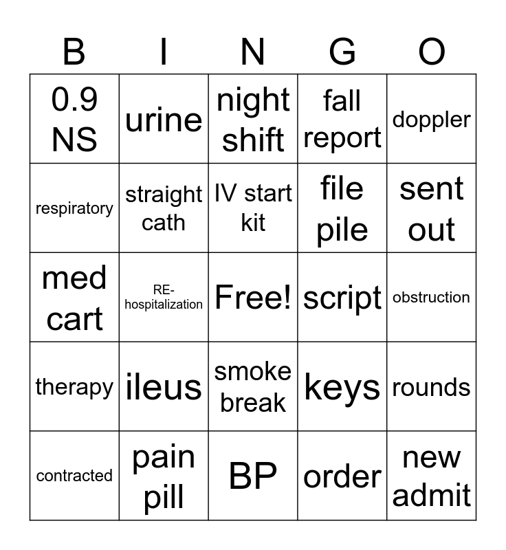 This bingo card has a free space and 24 words: ileus, pain pill, IV start kit, contracted, doppler, 0.9 NS, respiratory, urine, script, smoke break, file pile, med cart, keys, rounds, straight cath, order, obstruction, night shift, sent out, RE- hospitalization, new admit, therapy, fall report and BP.