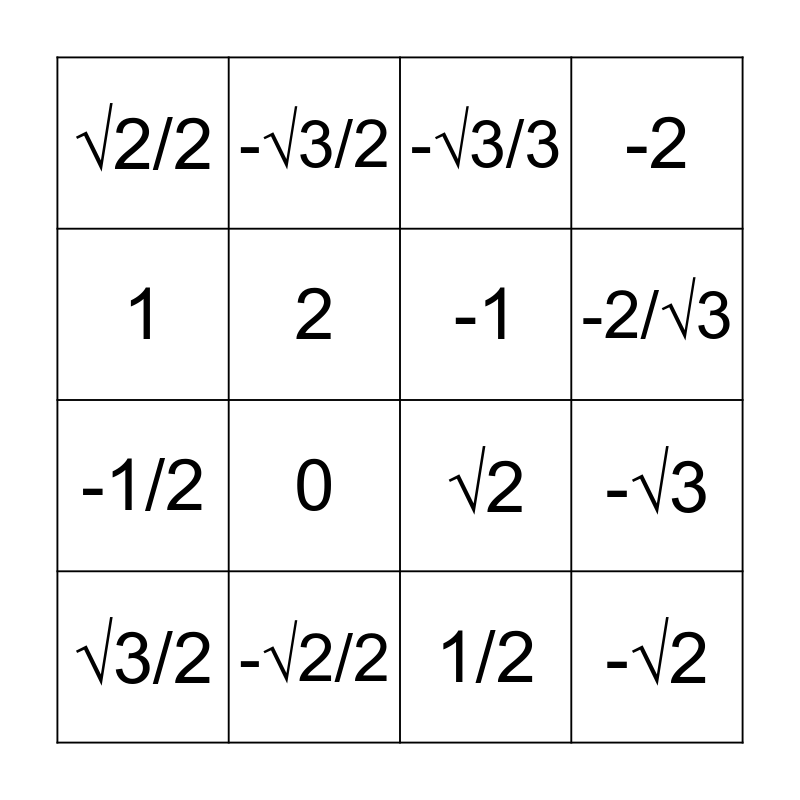 This bingo card has 19 words: √2, √3/3, -√3/3, -√2, -√3, 1, 1/2, √2/2, -√3/2, -1/2, 0, 2, -1, -√2/2, √3/2, 2/√3, -2, -2/√3 and √3.