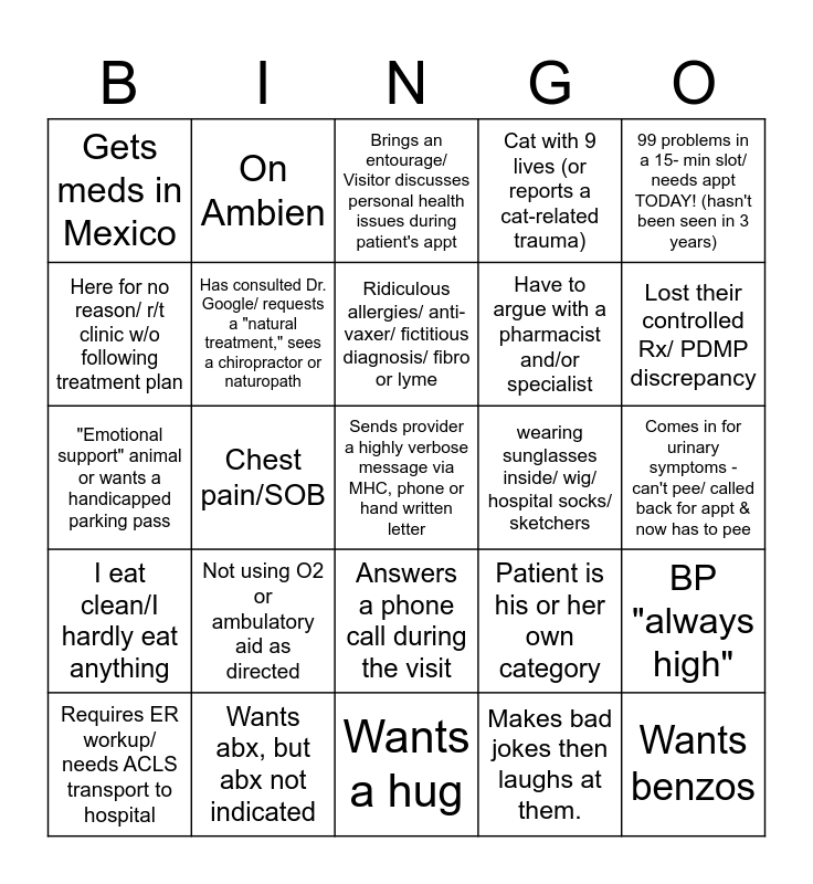 This bingo card has 25 words: Not using O2 or ambulatory aid as directed, Wants a hug, Ridiculous allergies/ anti-vaxer/ fictitious diagnosis/ fibro or lyme, Requires ER workup/ needs ACLS transport to hospital, 99 problems in a 15- min slot/ needs appt TODAY! (hasn't been seen in 3 years), Gets meds in Mexico, Here for no reason/ r/t clinic w/o following treatment plan, On Ambien, wearing sunglasses inside/ wig/ hospital socks/ sketchers, Answers a phone call during the visit, Have to argue with a pharmacist and/or specialist, "Emotional support" animal or wants a handicapped parking pass, Patient is his or her own category, BP "always high", Has consulted Dr. Google/ requests a "natural treatment," sees a chiropractor or naturopath, Wants benzos, Comes in for urinary symptoms - can't pee/ called back for appt & now has to pee, Brings an entourage/ Visitor discusses personal health issues during patient's appt, Lost their controlled Rx/ PDMP discrepancy, Chest pain/SOB, Sends provider a highly verbose message via MHC, phone or hand written letter, Wants abx, but abx not indicated, I eat clean/I hardly eat anything, Cat with 9 lives (or reports a cat-related trauma) and Makes bad jokes then laughs at them..