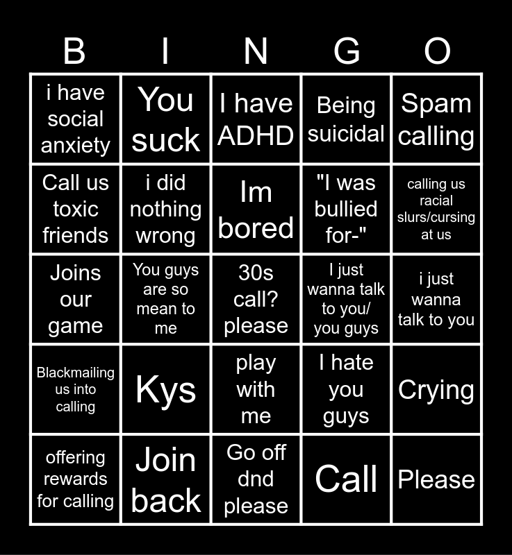 This bingo card has 30 words: Join back, Why, You guys are so mean to me, You are the worst friend/friends ever, i have social anxiety, I have ADHD, i did nothing wrong, play with me, I just wanna talk to you/ you guys, Go off dnd please, i just wanna talk to you, 30s call? please, Call, Please, calling us racial slurs/cursing at us, do you wanna play something, I hate you guys, Blackmailing us into calling, Kys, Spam calling, Joins our game, Voice message, You suck, "I was bullied for-", Call us toxic friends, Being suicidal, Crying, offering rewards for calling, Im bored and When can you call.