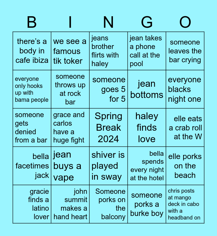 This bingo card has a free space and 24 words: jean buys a vape, john summit makes a hand heart, someone goes 5 for 5, gracie finds a latino lover, someone leaves the bar crying, there’s a body in cafe ibiza, everyone only hooks up with bama people, we see a famous tik toker, haley finds love, shiver is played in sway, jean bottoms, someone gets denied from a bar, bella spends every night at the hotel, elle porks on the beach, someone throws up at rock bar, someone porks a burke boy, elle eats a crab roll at the W, jeans brother flirts with haley, everyone blacks night one, grace and carlos have a huge fight, chris posts at mango deck in cabo with a headband on, bella facetimes jack, jean takes a phone call at the pool and Someone porks on the balcony.