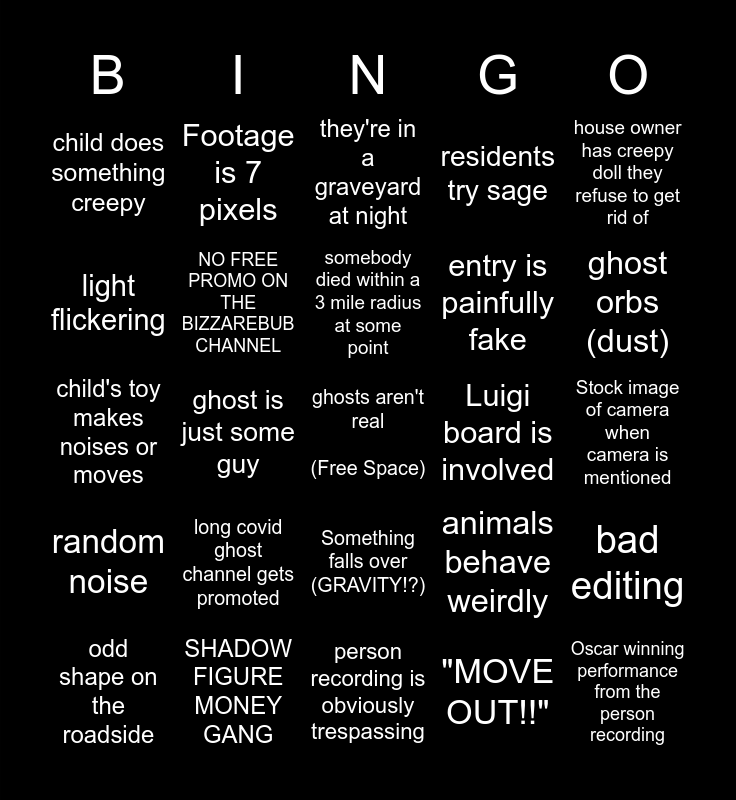 This bingo card has a free space and 24 words: odd shape on the roadside, long covid ghost channel gets promoted, somebody died within a 3 mile radius at some point, "MOVE OUT!!", house owner has creepy doll they refuse to get rid of, child does something creepy, Footage is 7 pixels, they're in a graveyard at night, Luigi board is involved, Stock image of camera when camera is mentioned, child's toy makes noises or moves, NO FREE PROMO ON THE BIZZAREBUB CHANNEL, animals behave weirdly, bad editing, light flickering, SHADOW FIGURE MONEY GANG, person recording is obviously trespassing, residents try sage, ghost orbs (dust), random noise, ghost is just some guy, Something falls over (GRAVITY!?), entry is painfully fake and Oscar winning performance from the person recording.