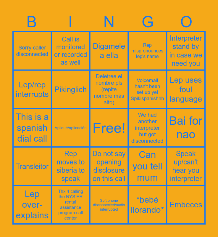 This bingo card has a free space and 53 words: Rep huffin' and puffin', Embeces, Lep speaks English perfectly, *bebé llorando*, Rep moves to siberia to speak, It was a yes or no question TT^TT, Call is monitored or recorded as well, Lep is watching the tv, Lep/rep interrupts, Medicaciones, Ax 4 the social, Pikinglich, Rep cuelga sin explicación ni gracias, Speak up/can't hear you interpreter, Can you tell mum, Voicemail is full and cannot accept any msgs at this time, Lep over-explains, Deletree el nombre pls (repite nombre más alto), We had another interpreter but got disconnected, Lep manejando no pone atención, Interpreter stand by in case we need you, Apliqué/aplicación, Mi amol, Voicemail hasn't been set up yet Spikispanishhh, Sorry caller disconnected, 2 interpreters on the line, Thx 4 calling the NYS ER rental assistance program call center, Lep tries to speak English, Lep alone on the line, Solo una preguntica (no era una pregunta)., Lep uses foul language, Have to disqualify myself from the call, Rep rap-gods the disclosures, Lep says something racist/homophobic, Hold for the provider, Azeguranza, Wrong language, Rep mispronounces lep's name, Soft phone disconnected/audio interrupted, Digamele a ella, Upon chekin jir, Rep mispronounces ur name, I speak a bit of Spanish, Bai for nao, Puje siniora, Interpreter are you there, Do not say opening disclosure on this call, Fustans, Multiple dial outs, This is a spanish dial call, Transleitor, Se me cayó el internet, Interpretator/interpeter and Rep didn't say pls or thx.