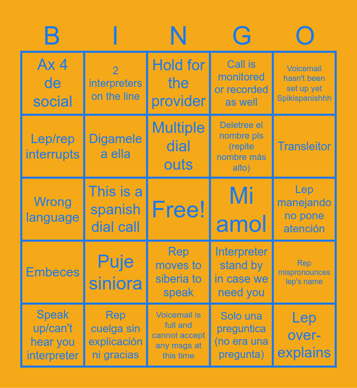 This bingo card has a free space and 54 words: Rep huffin' and puffin', Embeces, Lep speaks English perfectly, *bebé llorando*, Rep moves to siberia to speak, It was a yes or no question TT^TT, Call is monitored or recorded as well, Lep is watching the tv, Lep/rep interrupts, Medicaciones, Ax 4 de social, Pikinglich, Rep cuelga sin explicación ni gracias, Speak up/can't hear you interpreter, Can you tell mum, Voicemail is full and cannot accept any msgs at this time, Lep over-explains, Deletree el nombre pls (repite nombre más alto), We had another interpreter but got disconnected, Lep manejando no pone atención, Interpreter stand by in case we need you, Apliqué/aplicación, Mi amol, Voicemail hasn't been set up yet Spikispanishhh, The caller disconnected, sorry interpreter UnU, 2 interpreters on the line, Thx 4 calling the NYS Emergency rental assistance program call center, Lep tries to speak English, Lep alone on the line, Solo una preguntica (no era una pregunta), Lep uses foul language, Have to disqualify myself from the call, Rep rap-gods the disclosures, Lep says something racist/homophobic, Hold for the provider, Azeguranza, Wrong language, Rep mispronounces lep's name, Soft phone disconnected/audio interrupted, Digamele a ella, Upon chekin jir, Rep mispronounces ur name, I speak a bit of Spanish, Bai for nao, Puje siniora, Interpreter are you there, Do not say opening disclosure on this call, Fustans, Multiple dial outs, This is a spanish dial call, Transleitor, Se me cayó el internet, Interpretator/interpeter and Rep didn't say pls or thx.