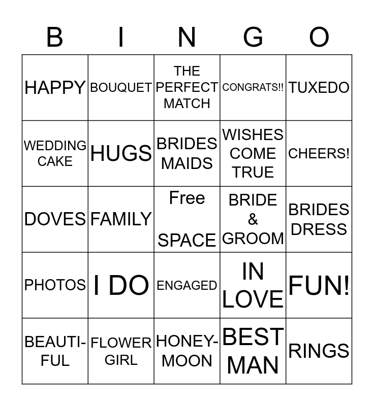This bingo card has a free space and 24 words: I DO, FLOWER GIRL, BRIDES MAIDS, BEAUTI- FUL, TUXEDO, HAPPY, WEDDING CAKE, BOUQUET, BRIDE & GROOM, ENGAGED, WISHES COME TRUE, DOVES, IN LOVE, FUN!, HUGS, BEST MAN, BRIDES DRESS, THE PERFECT MATCH, CHEERS!, FAMILY, RINGS, PHOTOS, CONGRATS!! and HONEY- MOON.