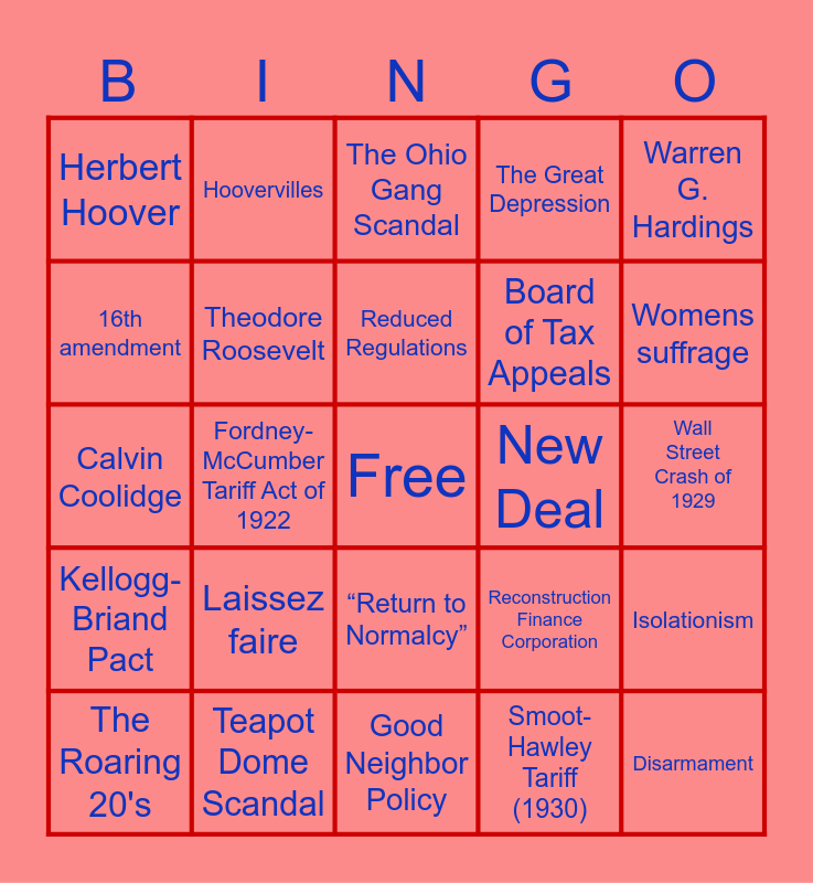 This bingo card has a free space and 26 words: “Return to Normalcy”, Smoot-Hawley Tariff (1930), Reduced Regulations, Teapot Dome Scandal, Warren G. Hardings, Herbert Hoover, 16th amendment, Hoovervilles, Wall Street Crash of 1929, Reconstruction Finance Corporation, Board of Tax Appeals, Calvin Coolidge, Isolationism, The Roaring 20's, Fordney-McCumber Tariff Act of 1922, Revenue Act of 1924, The Great Depression, Kellogg-Briand Pact, The Ohio Gang Scandal, Disarmament, Womens suffrage, Good Neighbor Policy, New Deal, Laissez faire, Theodore Roosevelt and Republican.