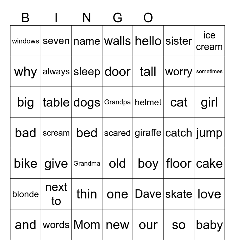 This bingo card has a free space and 55 words: our, girl, house, windows, scream, next to, ice cream, motorbike, always, thin, walls, cake, jump, catch, and, bike, hello, tall, so, worry, sometimes, give, helmet, name, monkey, why, bed, boots, big, cat, call, floor, love, words, sister, door, blonde, table, baby, Grandma, seven, one, Dave, Tuesday, dogs, bad, Mom, boy, giraffe, sleep, old, skate, new, Grandpa and kid.