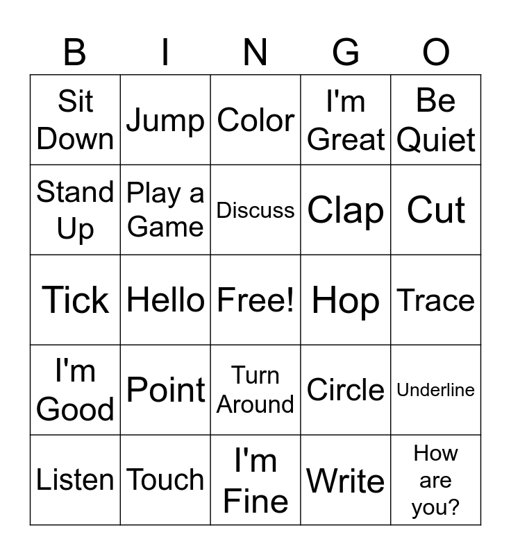 This bingo card has a free space and 24 words: Point, Touch, Discuss, Listen, Be Quiet, Sit Down, Stand Up, Jump, Hop, Turn Around, Clap, Tick, Circle, Underline, Play a Game, Write, Trace, Color, Cut, Hello, How are you?, I'm Good, I'm Great and I'm Fine.