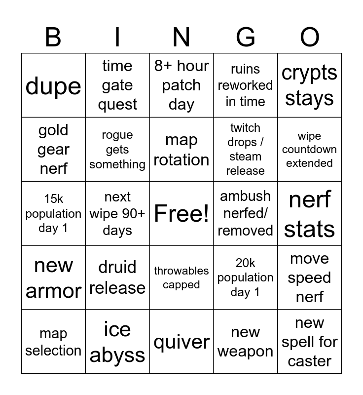 This bingo card has a free space and 24 words: druid release, ice abyss, map rotation, map selection, crypts stays, dupe, gold gear nerf, time gate quest, ambush nerfed/ removed, throwables capped, twitch drops / steam release, 15k population day 1, 20k population day 1, move speed nerf, rogue gets something, new weapon, nerf stats, 8+ hour patch day, wipe countdown extended, next wipe 90+ days, new spell for caster, new armor, ruins reworked in time and quiver.