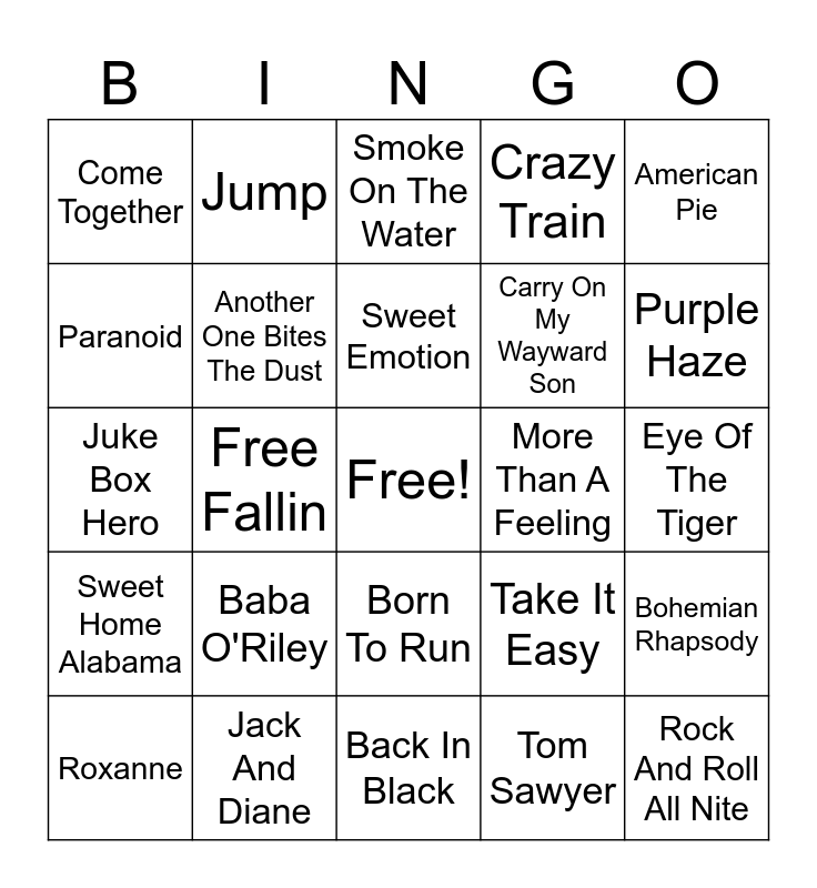 This bingo card has a free space and 25 words: Baba O'Riley, Back In Black, Sweet Emotion, Roxanne, American Pie, Come Together, Paranoid, Jump, More Than A Feeling, Born To Run, Carry On My Wayward Son, Juke Box Hero, Take It Easy, Bohemian Rhapsody, Another One Bites The Dust, Barracuda, Eye Of The Tiger, Smoke On The Water, Purple Haze, Free Fallin, Rock And Roll All Nite, Jack And Diane, Sweet Home Alabama, Crazy Train and Tom Sawyer.