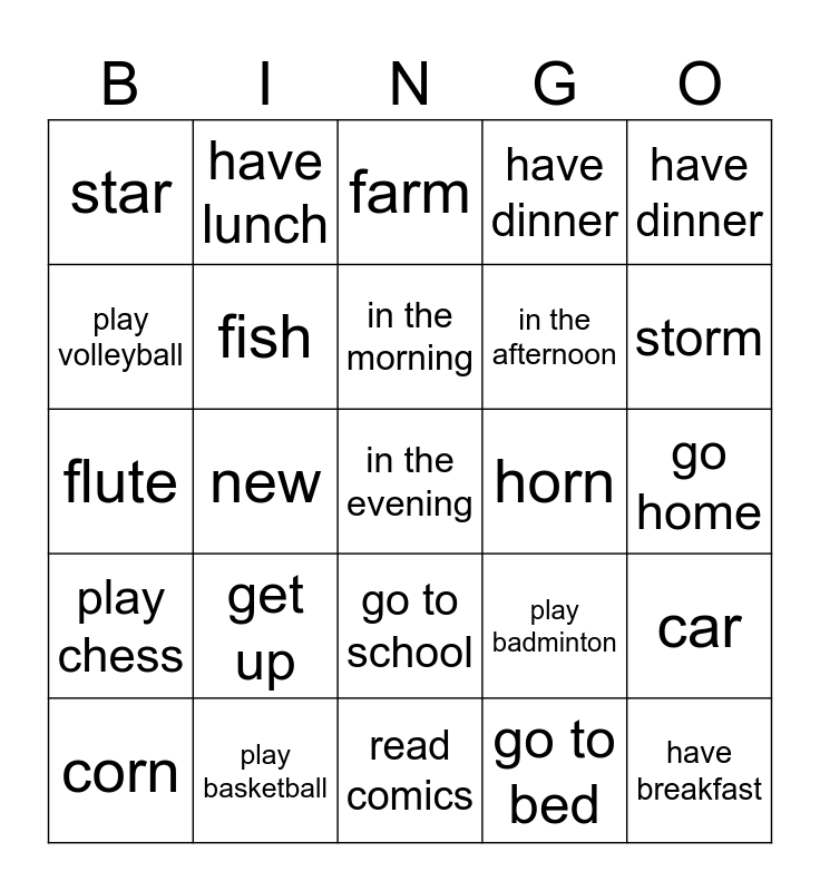 This bingo card has 25 words: get up, read comics, in the morning, corn, have dinner, star, play volleyball, have lunch, horn, go to school, in the afternoon, flute, play badminton, car, fish, have breakfast, go home, farm, storm, new, in the evening, play basketball, play chess, have dinner and go to bed.