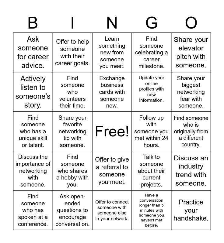 This bingo card has a free space and 24 words: Find someone who has spoken at a conference., Find someone who shares a hobby with you., Exchange business cards with someone new., Have a conversation longer than 5 minutes with someone you haven't met before., Share your elevator pitch with someone., Ask someone for career advice., Offer to help someone with their career goals., Learn something new from someone you meet., Follow up with someone you met within 24 hours., Find someone who is originally from a different country., Find someone who has a unique skill or talent., Find someone who volunteers their time., Talk to someone about their current projects., Discuss an industry trend with someone., Actively listen to someone's story., Ask open-ended questions to encourage conversation., Offer to connect someone with someone else in your network., Find someone celebrating a career milestone., Share your biggest networking fear with someone., Discuss the importance of networking with someone., Share your favorite networking tip with someone., Offer to give a referral to someone you meet., Update your online profiles with new information. and Practice your handshake..