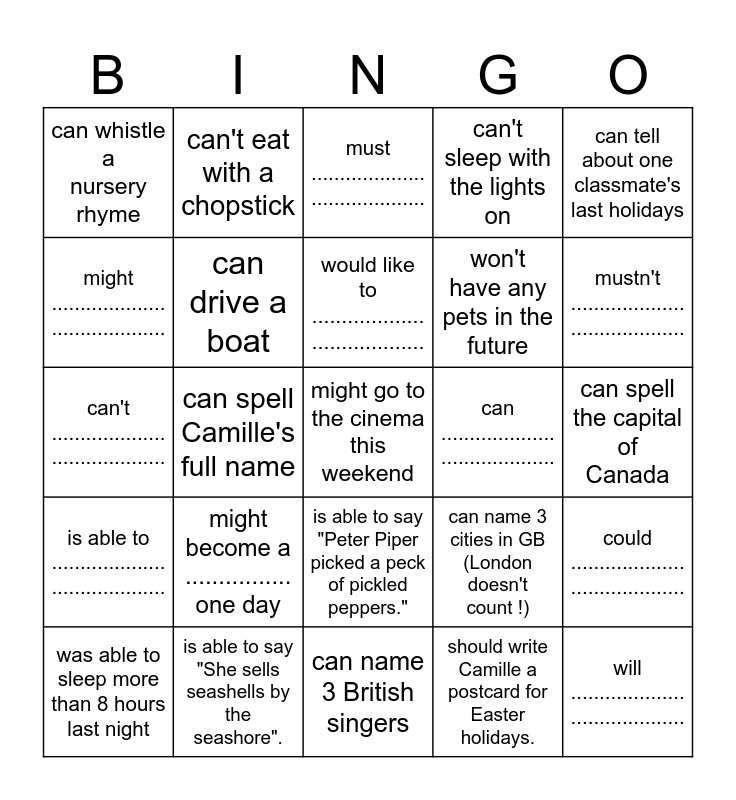 This bingo card has 25 words: might become a ................ one day, can name 3 British singers, would like to ................... ..................., was able to sleep more than 8 hours last night, can tell about one classmate's last holidays, can whistle a nursery rhyme, might .................... ...................., can't eat with a chopstick, can .................... ...................., is able to say "Peter Piper picked a peck of pickled peppers.", won't have any pets in the future, can't .................... ...................., can name 3 cities in GB (London doesn't count !), could .................... ...................., can drive a boat, will .................... ...................., can spell the capital of Canada, must .................... ...................., mustn't .................... ...................., can spell Camille's full name, might go to the cinema this weekend, is able to say "She sells seashells by the seashore"., is able to .................... ...................., can't sleep with the lights on and should write Camille a postcard for Easter holidays..