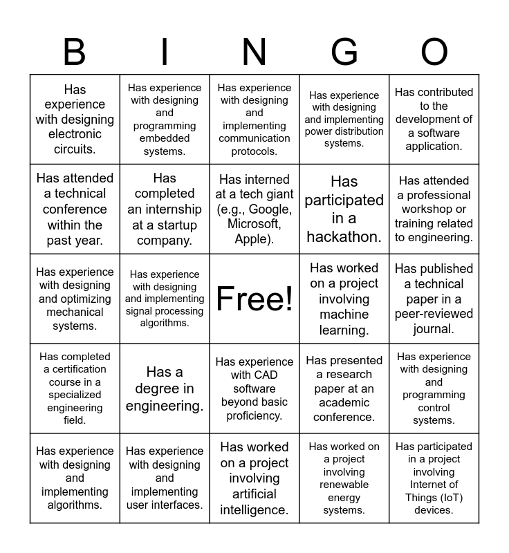 This bingo card has a free space and 25 words: Has a degree in engineering., Has worked on a project involving artificial intelligence., Has interned at a tech giant (e.g., Google, Microsoft, Apple)., Has experience with designing and implementing algorithms., Has contributed to the development of a software application., Has experience with designing electronic circuits., Has attended a technical conference within the past year., Has experience with designing and programming embedded systems., Has worked on a project involving machine learning., Has experience with CAD software beyond basic proficiency., Has participated in a hackathon., Has experience with designing and optimizing mechanical systems., Has presented a research paper at an academic conference., Has experience with designing and programming control systems., Has completed an internship at a startup company., Has experience with designing and implementing database systems., Has published a technical paper in a peer-reviewed journal., Has experience with designing and implementing communication protocols., Has attended a professional workshop or training related to engineering., Has experience with designing and implementing signal processing algorithms., Has participated in a project involving Internet of Things (IoT) devices., Has experience with designing and implementing user interfaces., Has completed a certification course in a specialized engineering field., Has experience with designing and implementing power distribution systems. and Has worked on a project involving renewable energy systems..
